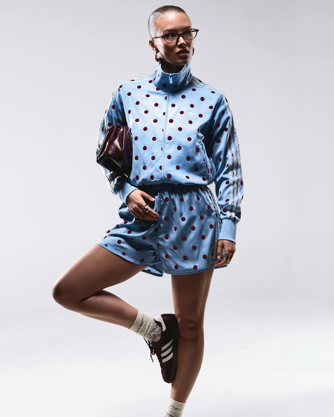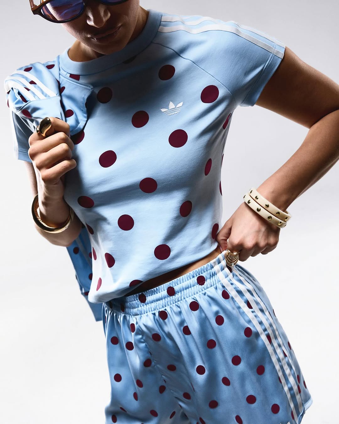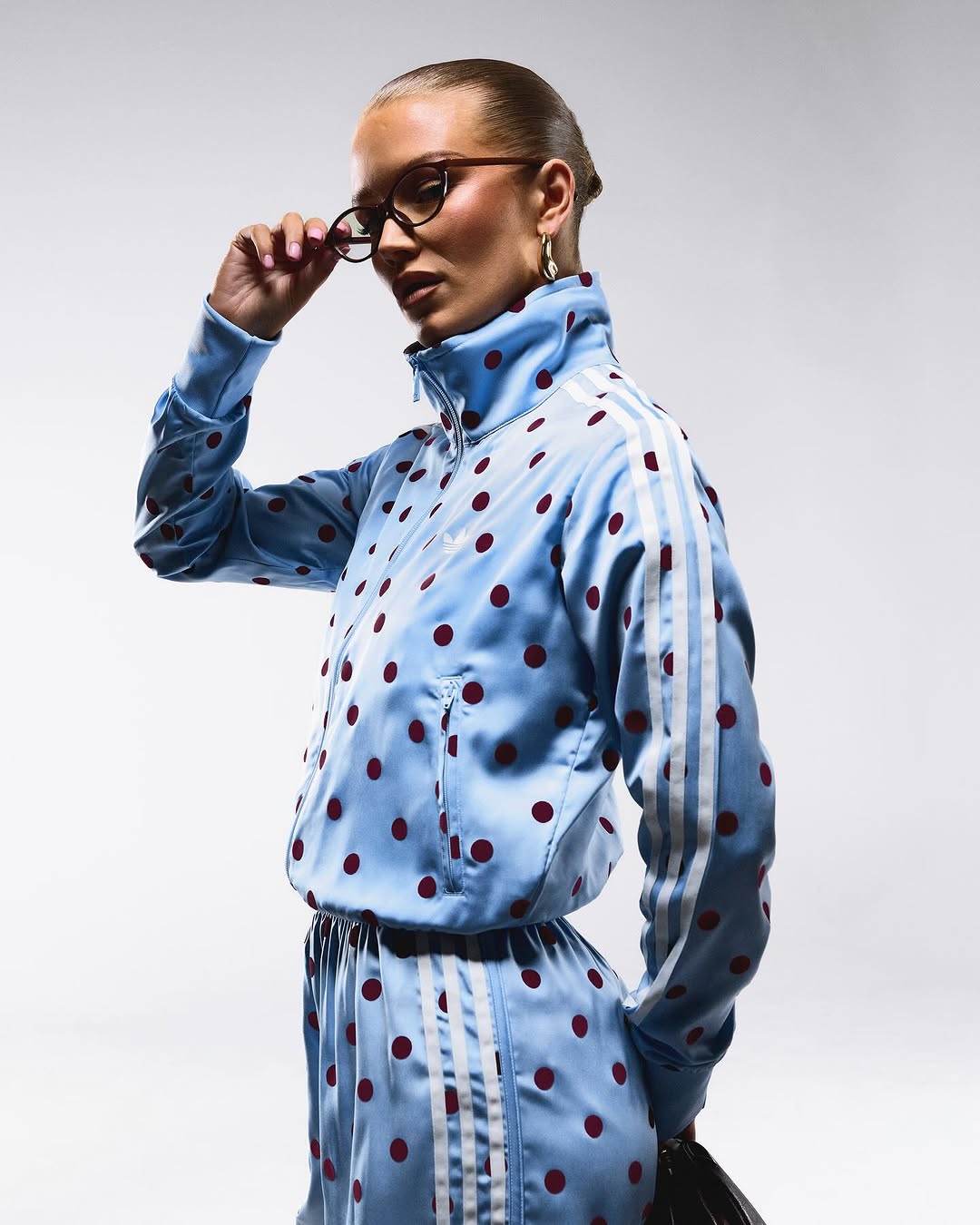 The core of the drop is the Satin Polka Dots TT track top, which keeps the familiar adidas track jacket shape, full zip, funnel neck, and Trefoil branding, but swaps in an all over polka dot pattern. It is positioned as a bridge between sport heritage and everyday streetwear, with styling on social pushing it from athletic to chic in one outfit change.