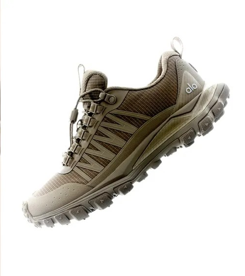 The Alo Trail features an oversized traction sole, a speed drawcord lacing system with a locking closure, a stabilizing heel clip, and a high rebound midsole compound encased in water resistant material.