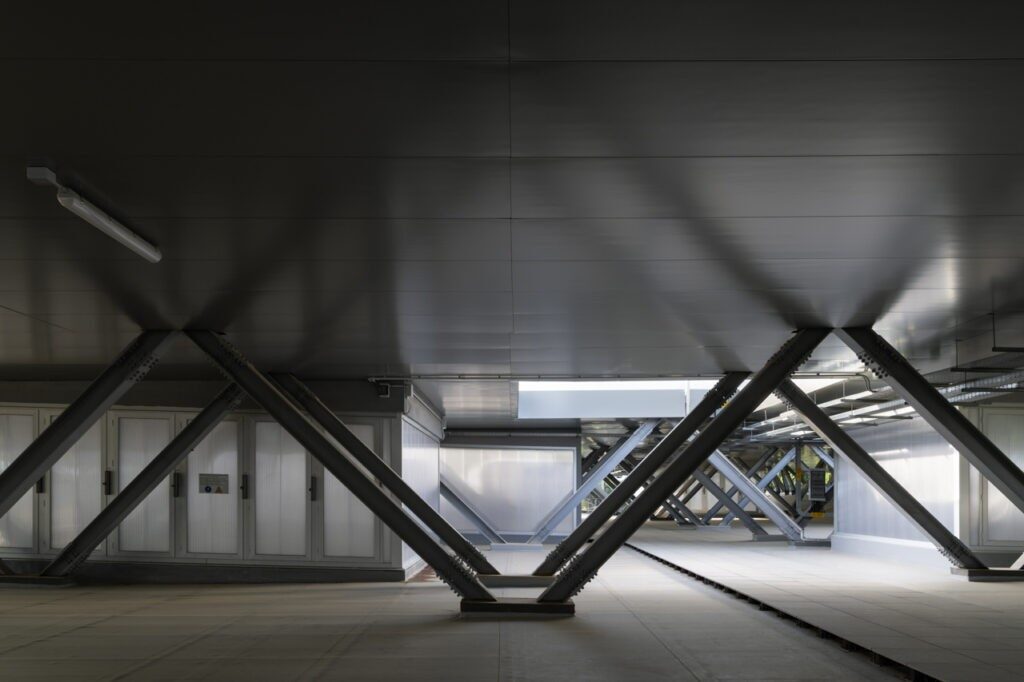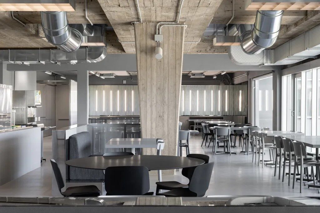 Above, a glazed lobby links to a garden and the training centre, while a connecting volume known as The Bridge has been redesigned to host the canteen and kitchen facilities, turning circulation space into social space. New material choices, exposed concrete, grey resin floors, glass, aluminium and visible technical systems softened by acoustic panels, create a raw yet precise architectural language that foregrounds making rather than hiding it.