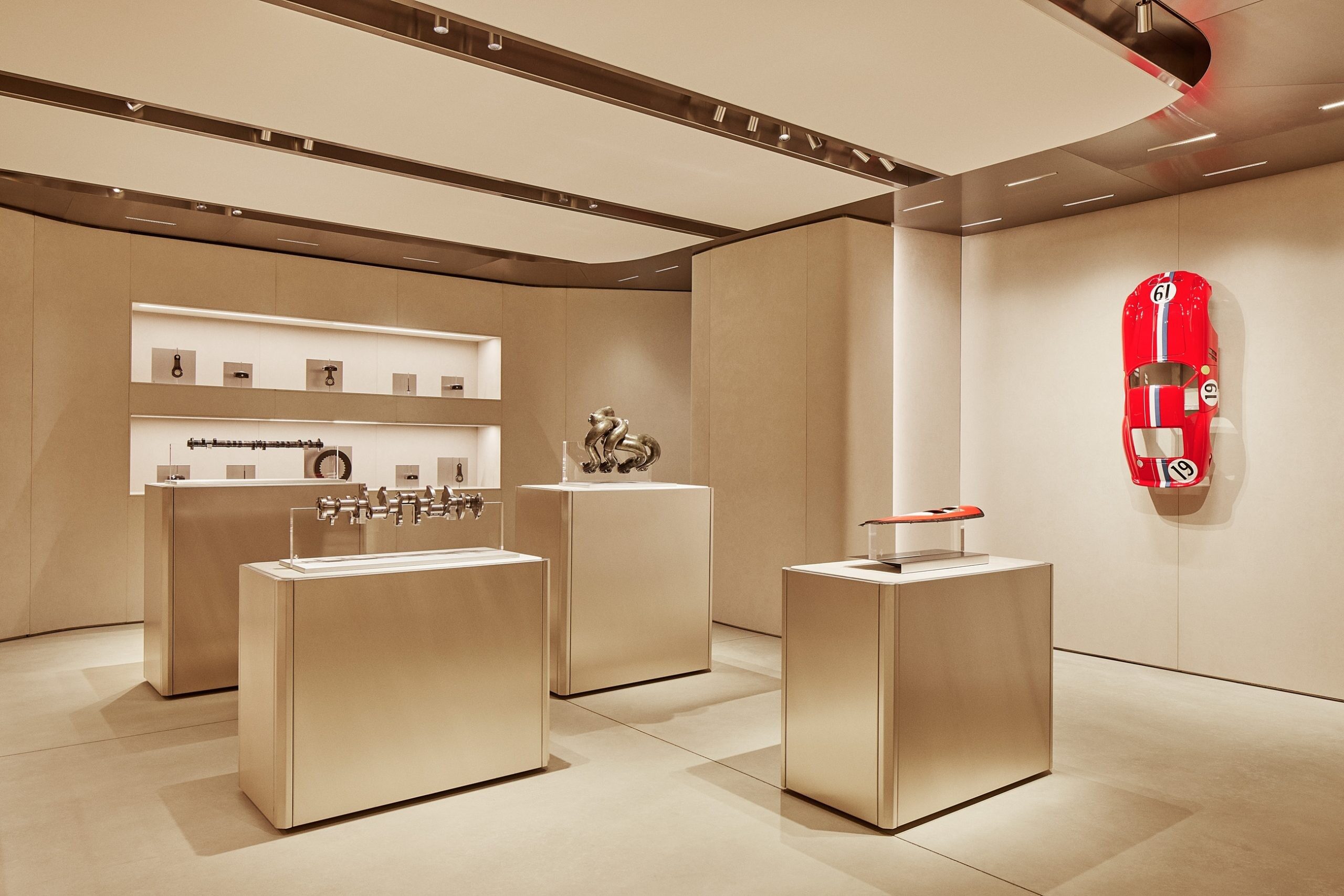 The store is arranged across several levels. Ground floor carries men’s and women’s ready to wear and accessories. The upper floor houses the Tailor Made Atelier, a made to order space with a circular table and floor to ceiling leather curtains. In addition, the basement level is dedicated to the Caveau. This is a private room featuring rare Ferrari components and collectibles sourced directly from Maranello.