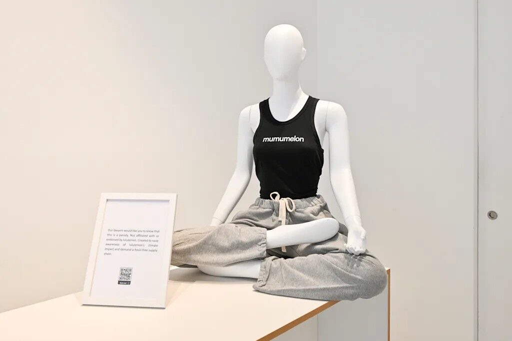 A climate advocacy group called Action Speaks Louder staged a faux pop up store in London in late March 2026 under the name Mumumelon, producing what it calls “deliberate shameless dupes” of Lululemon hoodies and yoga pants, made using renewable energy and a low emissions supply chain, and asking publicly why Lululemon cannot do the same.