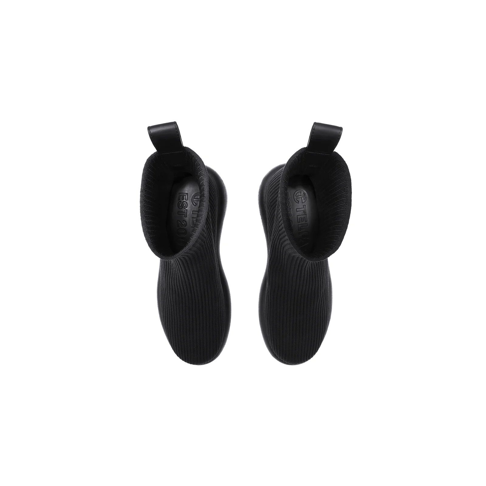 Both material directions carry equal weight in the lineup. The Mid Modular Boot arrives in 100% Nappa leather with a side zip and a Chelsea adjacent silhouette. Meanwhile, the Tall Modular Boot uses stretch ribbed knit with a leather logo pull tab that allows the shaft to be worn pulled high or slouched down. The Modular Mule is offered in both Stretch Leather and Knit versions. This gives the open back format two distinct textural identities while maintaining the same tubular heel coil.