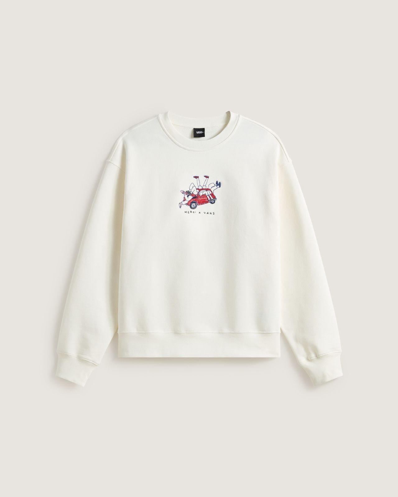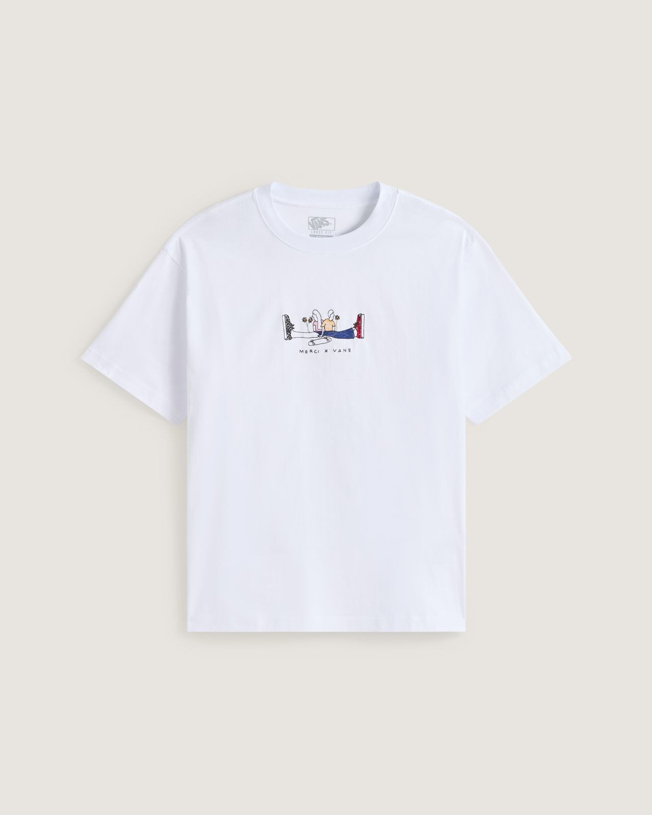 The capsule brings together hand drawn artwork, fine embroideries, subtle checker details, and tactile finishes across footwear and accessories. The range includes classic Vans silhouettes reworked with Merci’s refined aesthetic, a white skateboard deck, and an “Elegance of Disorder” bandana in a gabardine print, 100 percent cotton. The palette is described as refined yet playful, honoring the visual heritage of both brands without leaning too heavily on either.